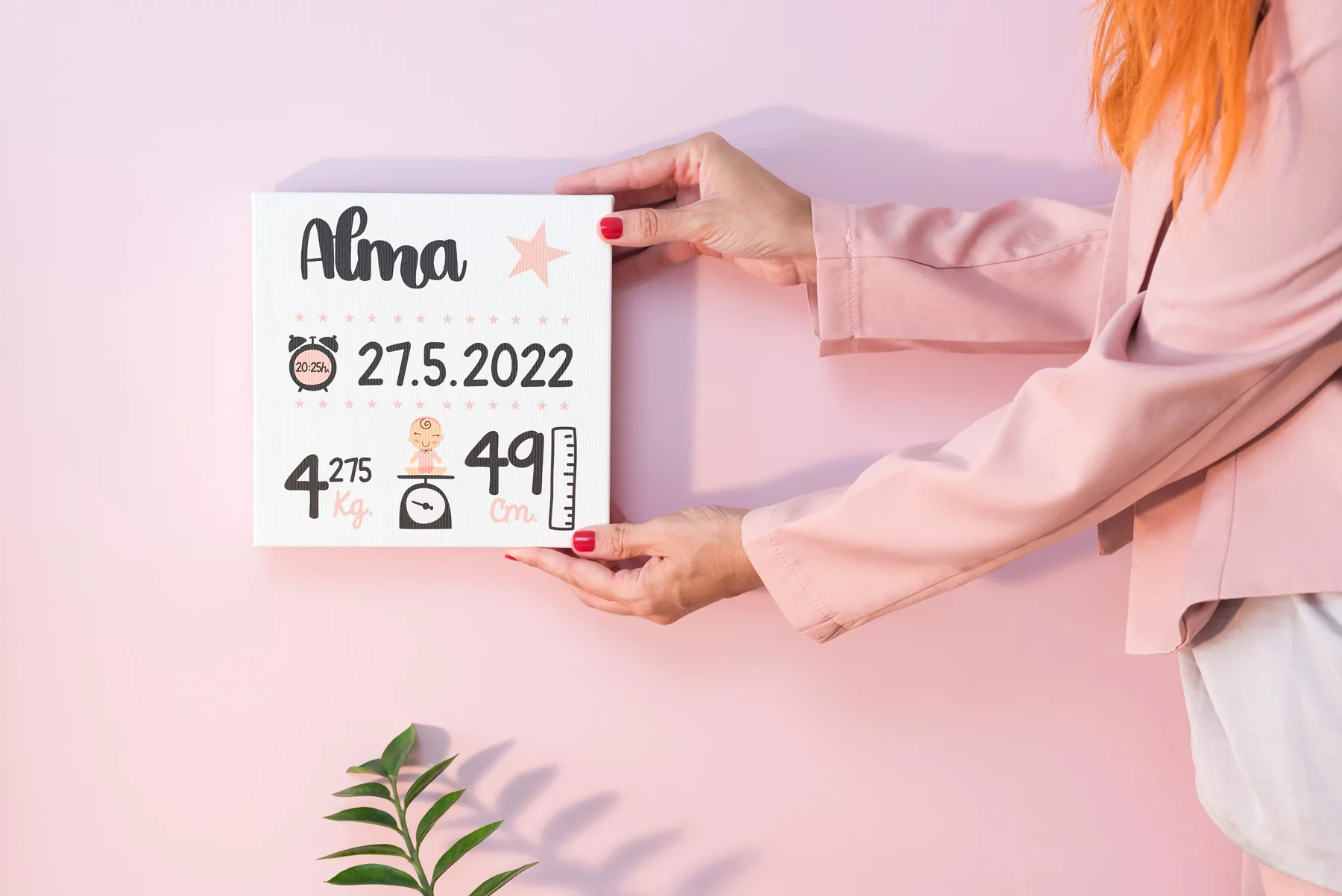 🎨 Diseño personalizado · Incluye nombre, fecha, hora de nacimiento, peso y medida del bebé.