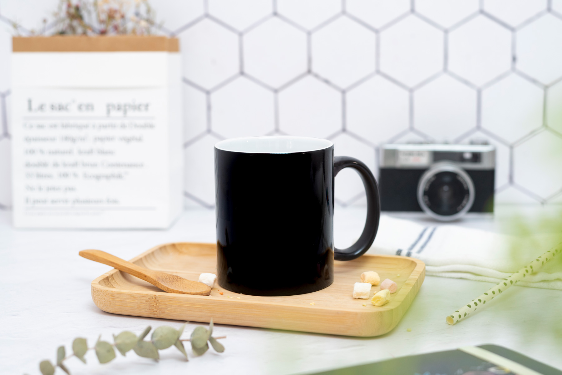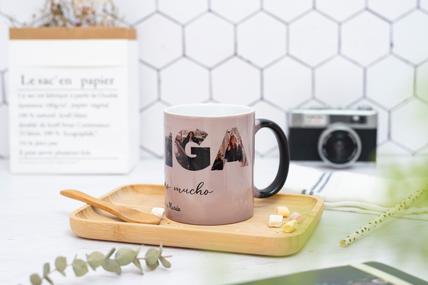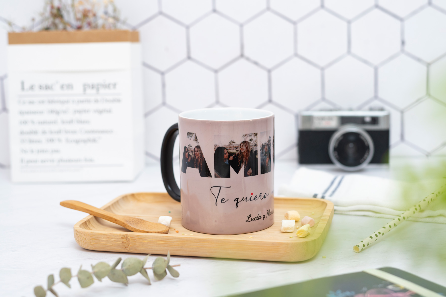 🖤 Efecto mágico · Taza negra que revela tu foto favorita al verter un líquido caliente.