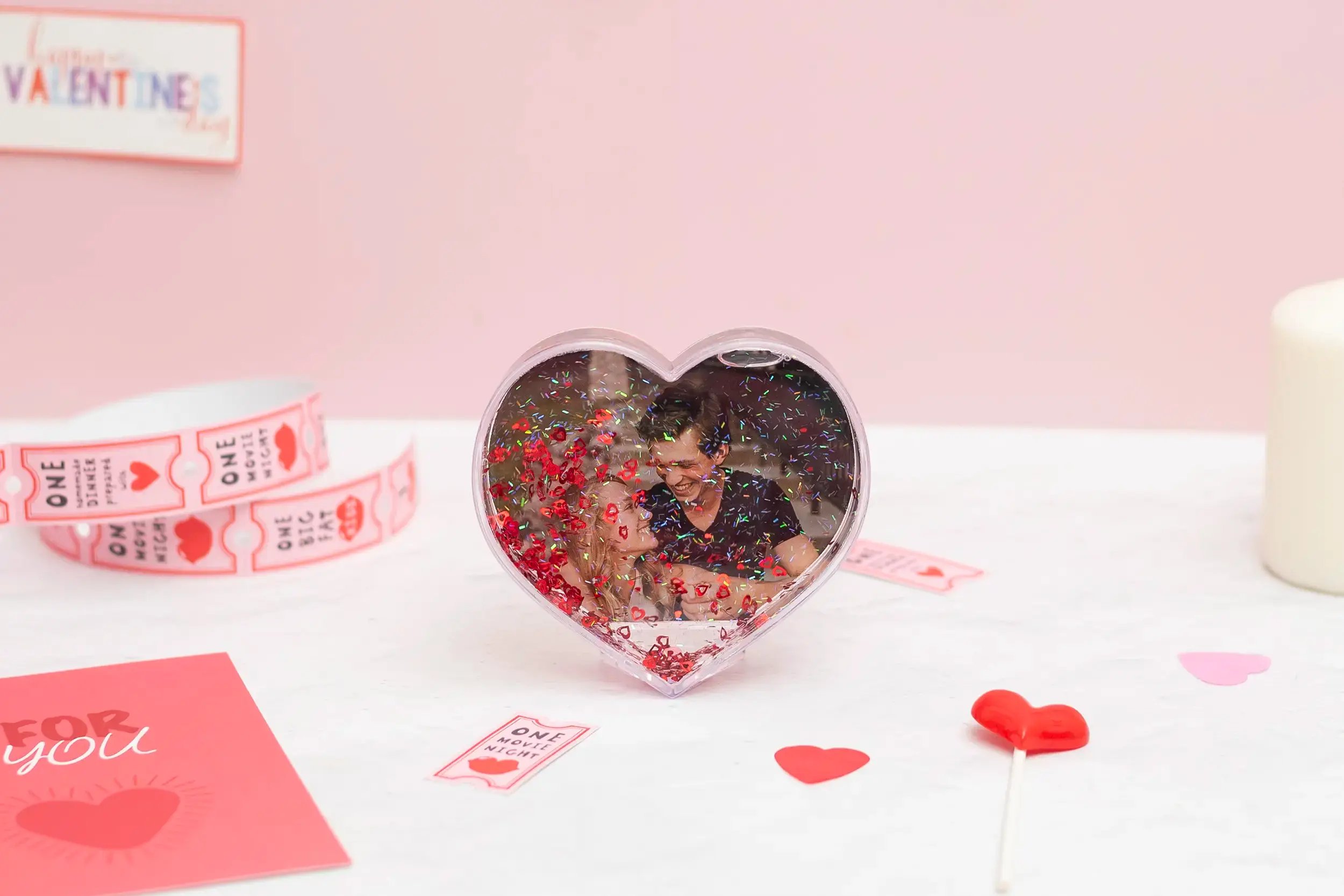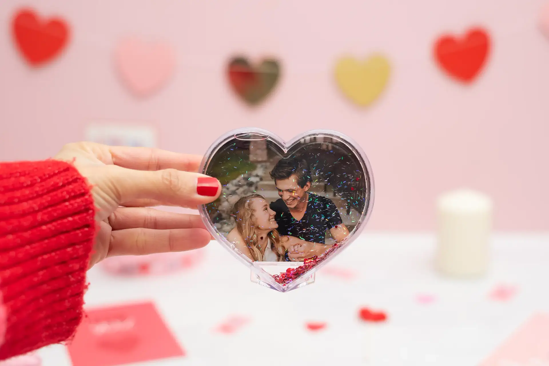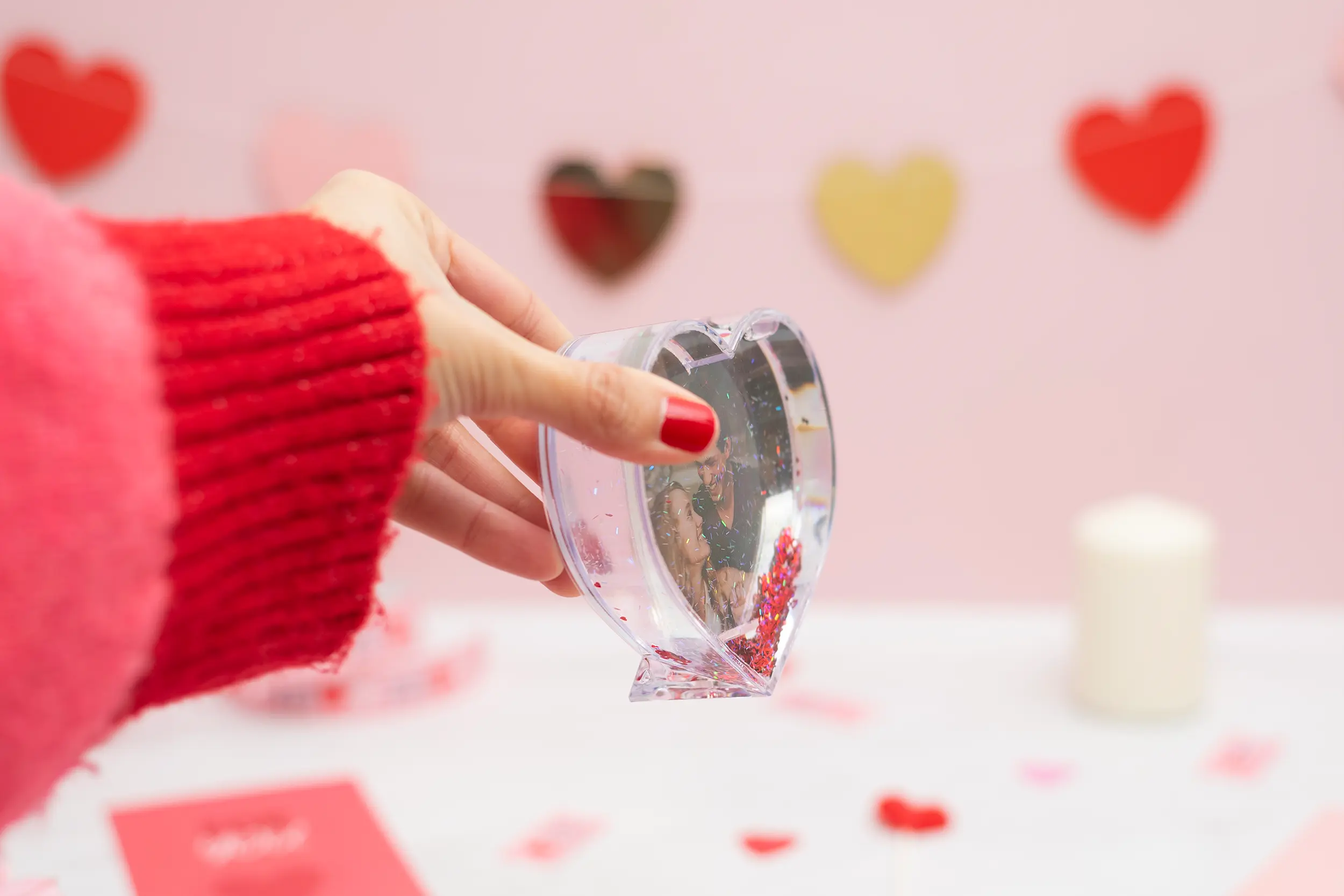 💧 Efecto bola de nieve · Se puede agitar para que los corazones floten y crear un efecto visual muy especial.