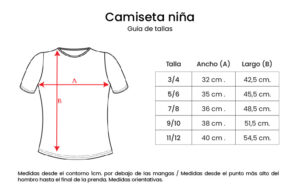 Tallas S M L XL XXL Ancho (A) – cm 48 50 54 58 62 Largo (B) – cm 69 71 73 75 77 Medidas desde el contorno, 1 cm por debajo de las mangas / Medidas desde el punto más alto del hombro hasta el final de la prenda. Estas medidas son orientativas.